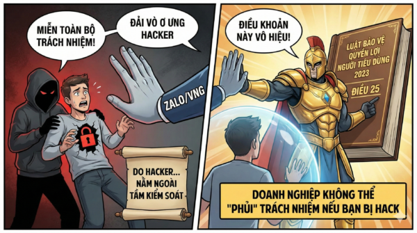 Theo Điều 25 của Luật Bảo vệ quyền lợi người tiêu dùng 2023, điều khoản này hoàn toàn vô hiệu. Pháp luật Việt Nam hiện nay nghiêm cấm các doanh nghiệp đơn phương loại trừ trách nhiệm pháp lý của mình đối với những rủi ro mà họ có nghĩa vụ phải quản lý, chẳng hạn như an ninh mạng.