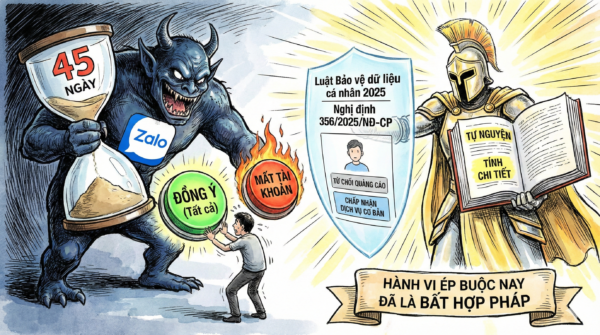 Theo quy định mới của Luật Bảo vệ dữ liệu cá nhân 2025 và Nghị định 356/2025/NĐ-CP, sự đồng ý hợp lệ phải thỏa mãn hai nguyên tắc cốt lõi mà Zalo đã vi phạm: “Tự nguyện” và “Tính chi tiết”. Nguyên tắc “Tự nguyện” yêu cầu người dùng phải có một lựa chọn thực sự, không bị đe dọa. Quan trọng hơn, nguyên tắc “Tính chi tiết” cấm các doanh nghiệp gộp chung nhiều mục đích khác nhau vào một nút “Đồng ý” duy nhất. Hành vi “gộp” này – buộc người dùng phải chấp nhận cả việc thu thập dữ liệu cho quảng cáo để được sử dụng tính năng nhắn tin cơ bản – nay đã bị cấm.
